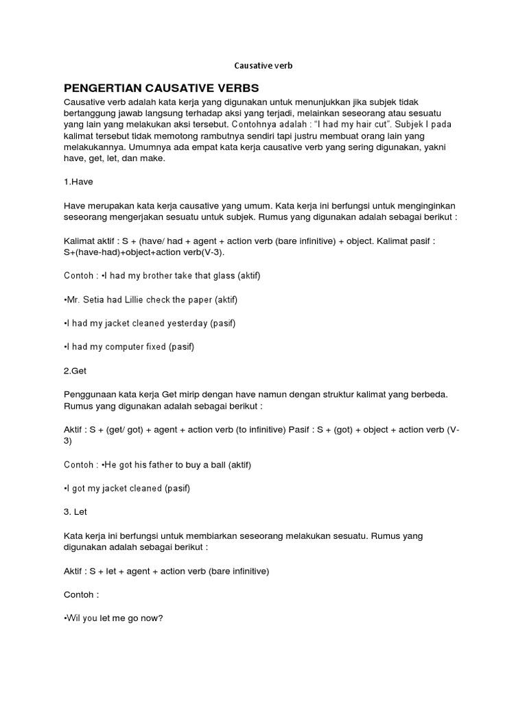 Causative Verb Bahan from imgv2-2-f.scribdassets.com Passive voice adalah kalimat yang dibalik subjek dan objeknya. Dalam mempelajari bahasa indonesia, dikenalkan berbagai macam contohnya adalah kalimat aktif dan kalimat pasif. (orang yang sedang belanja tersebut sedang ditanyai oleh polisi. Kalimat causative memiliki jenis kalimat aktif dan pasif, seperti pada contoh report textyang mengandung passive voice. Contoh kalimat active dan passive voicehe believes you. Begitulah contoh 20 kalimat pasif dan artinya dalam tenses simple past dan simple future. Artikel tentang contoh kalimat aktif dan kalimat pasif bahasa indonesia yang dibahas tuntas. (ayah saya membantu kakak saya untuk menyelesaikan.